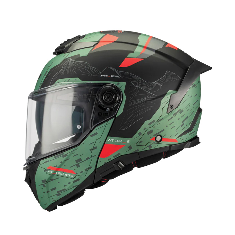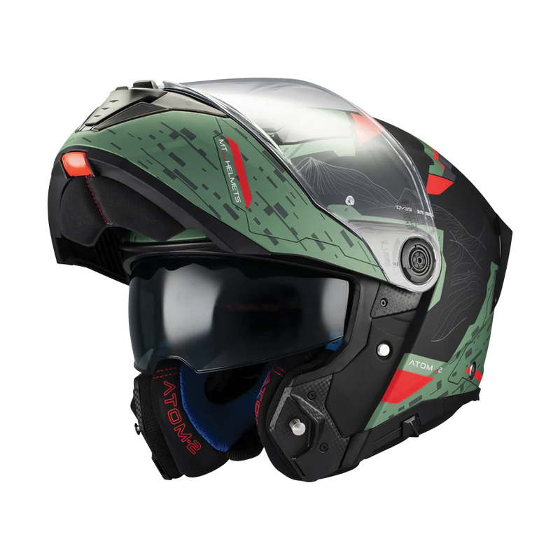 MT Atom 2 SV is a modular helmet with an aerodynamic design perfect for touring use. Made of HIRP, a very resistant and durable material. It has a large screen with anti-scratch treatment that offers a wide field of vision, compatible with Pinlock® and anti-fog systems (not included). Sun visor that guarantees correct protection against UV rays. Ventilation system with MT-AFCS technology that guarantees correct air flow.